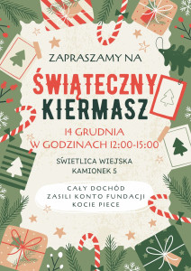 DRUGA EDYCJA ŚWIĄTECZNEGO KIERMASZU na rzecz Fundacji Kocie Piece! 14 grudnia, w godzinach 12:00 - 15:00. Już teraz rezerwujcie sobie termin, będą dodatkowe atrakcje, piękne przedmioty i świątecz...