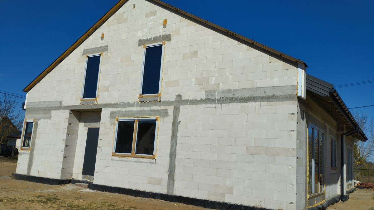 Materiał budowlany beton komórkowy, dach kryty dachówką ceramiczną. Ściana łącząca dwa odrębne domy z dwóch pustaków plus materiał , który tworzy dodatkowe wyciszenie.