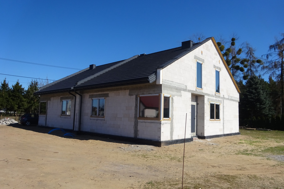 Materiał budowlany beton komórkowy, dach kryty dachówką ceramiczną. Ściana łącząca dwa odrębne domy z dwóch pustaków plus materiał , który tworzy dodatkowe wyciszenie.