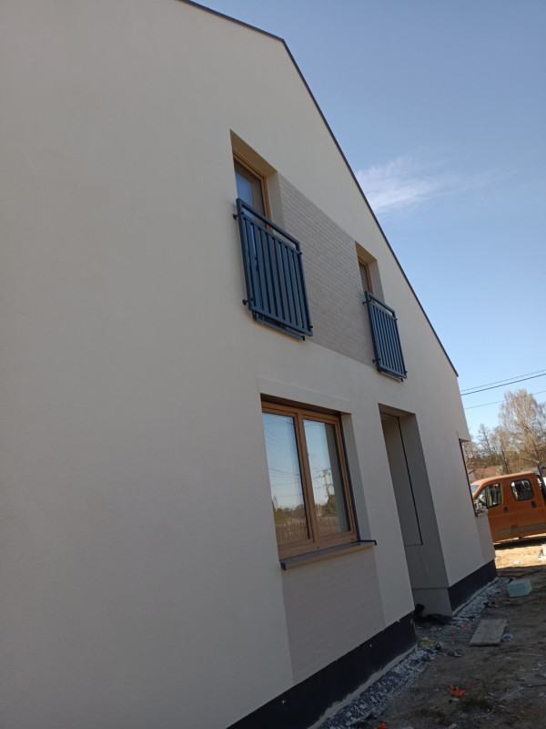 Materiał budowlany beton komórkowy, dach kryty dachówką ceramiczną. Ściana łącząca dwa odrębne domy z dwóch pustaków plus materiał , który tworzy dodatkowe wyciszenie.